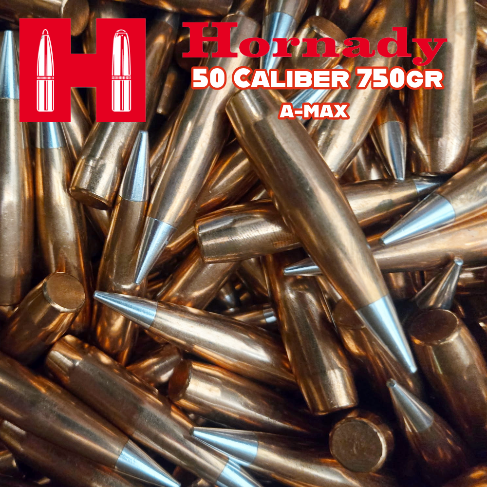 Engineered for match-grade perfection, these premium 750-grain A-MAX bullets deliver an exceptional G1 ballistic coefficient of 1.050 and sectional density of 0.412 — making them one of the highest-BC projectiles available. Featuring Hornady's renowned aerodynamic secant ogive profile, ultra low-drag polymer tip, swaged lead core, precision AMP® jacket, and optimized boattail design, they provide razor-flat trajectories, unbeatable long-range stability, and consistent accuracy that serious .50 BMG reloaders demand. Ideal for extreme-distance target shooting and precision reloading.
