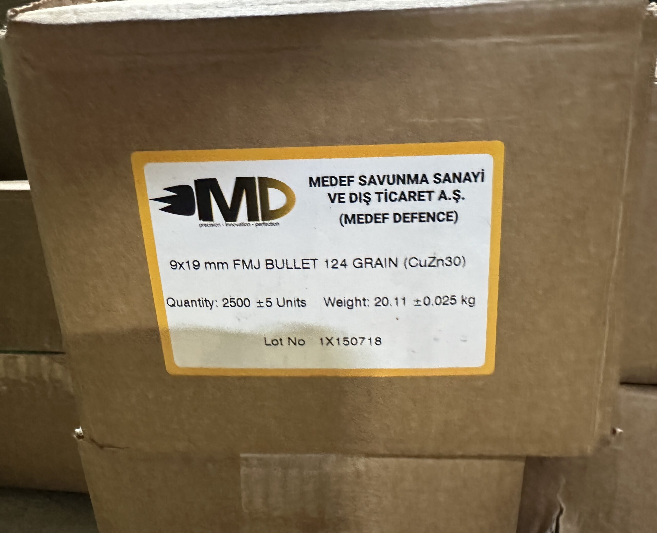 MEDEF's 9mm (.355") 124gr Full Metal Jacket (FMJ) bullets are made to deliver consistent performance at an incredible price point. These 9x19 mm Parabellum projectiles are manufactured with a CuZn30 brass alloy jacket. Compatible with NATO and CIP standards, this lot has an average diameter of .3545". This is not loaded ammunition. Bulk packaged. 2500 ct boxes are +/- 5 bullets.