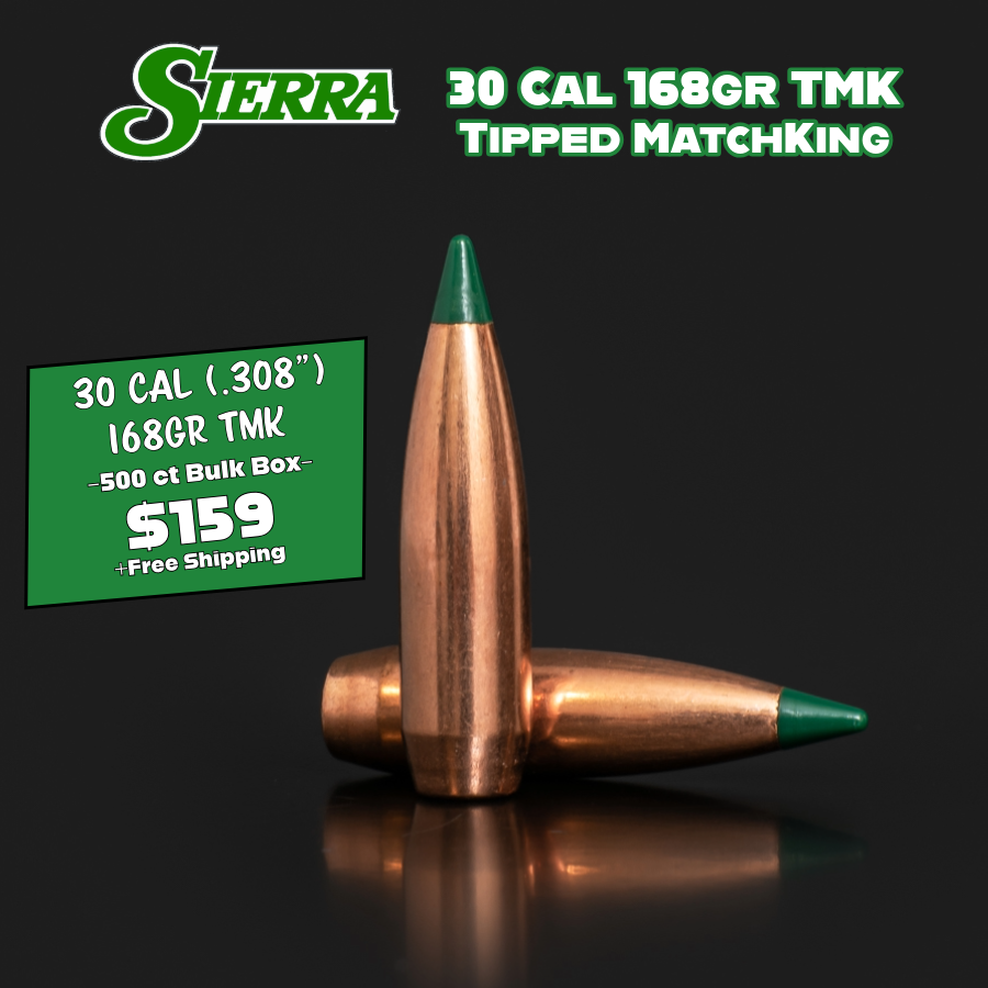 Brand new Sierra 30 Caliber (.308") 168gr Tipped MatchKing (TMK) HPBT Bullets available in bulk to pass along savings.